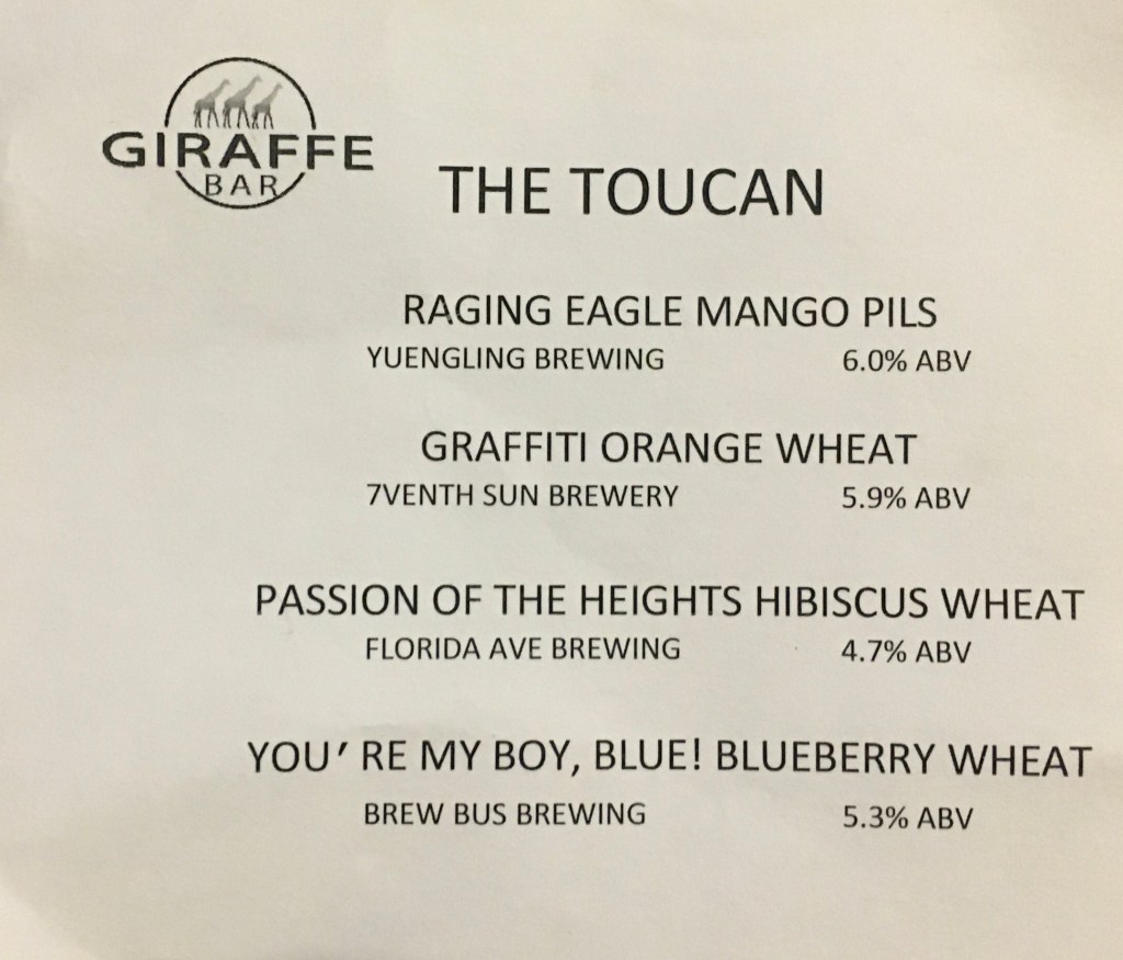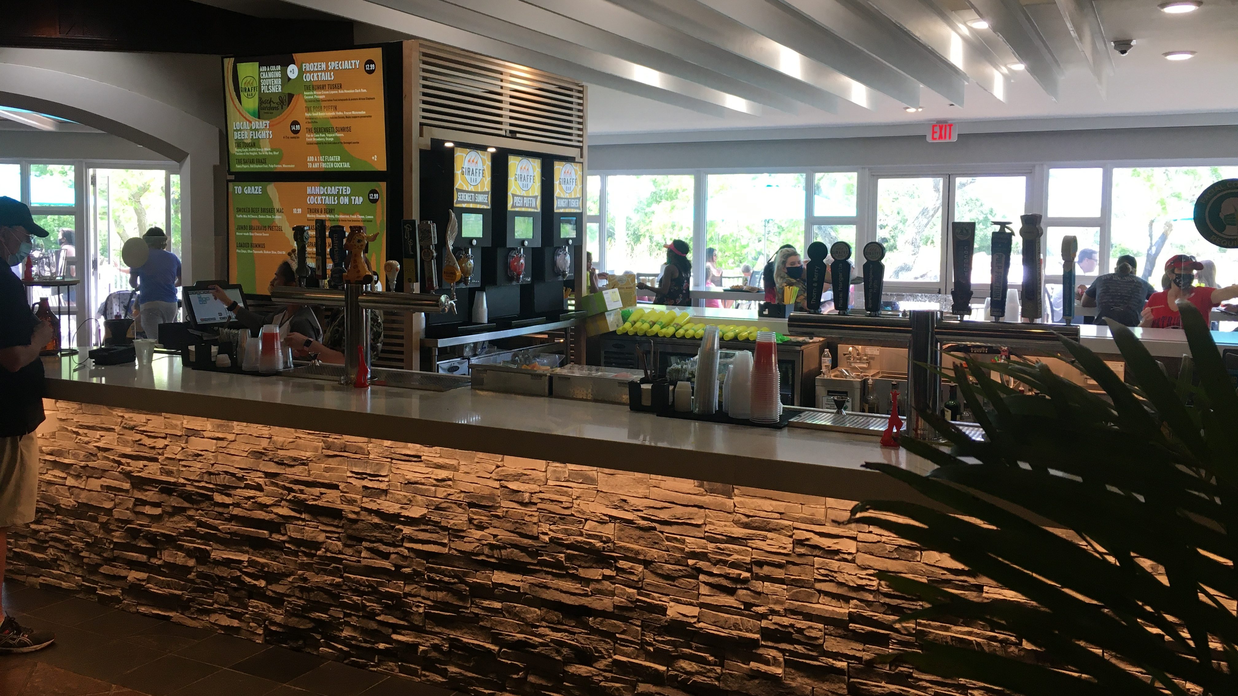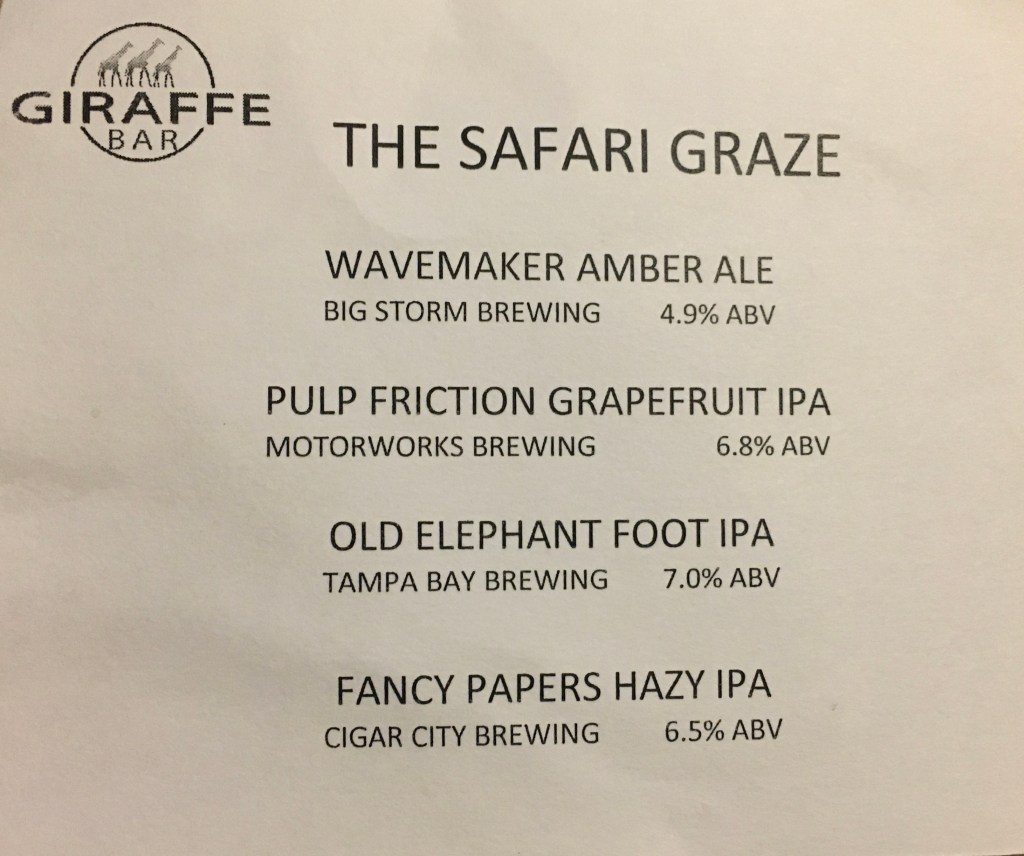 The drink selection and beer selection was not extensive, but adequate with something for everyone. There’s a diverse group of 8 craft beers, 3 frozen drinks and 3 cocktails on draft. We sampled both beer flights, the mojito, the Tusker and the Puffin. The yummy looking Serengeti Sunrise was unfortunately sold out both days. The frozen drinks were good tasting, but my wife commented they felt a little weak on the alcohol. However, she absolutely loved the mojito and found it to be quite strong too. The beers came in two flights of four 7oz glasses each and 28oz total is a healthy amount of beer for sure. The Safari Graze flight was mostly hoppy or hazy IPA’s where the Toucan flight was a more diverse group of beer styles with fruit flavors. Both flights were excellent and came from local Florida breweries. They also had a temperature color changing pilsner glass. It’s just plastic but is fun watching the color match the level of your drink or seeing your fingerprints on the glass. They even had a promo for a free pilsner for season pass members when we were there.