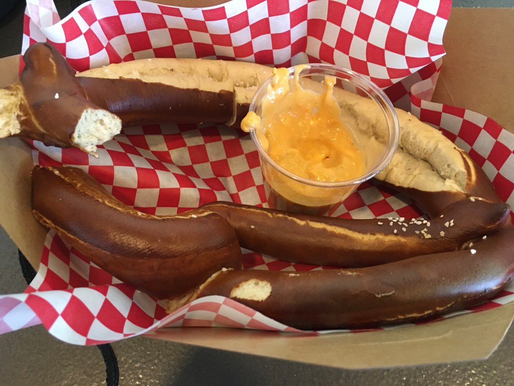 The bar food was a great surprise. They serve pretzels, brisket Man N Cheese and a hummas plate. With some of the longest lines being for food the week we were there it was great to have these fast and great choices available. The only one we sampled was the pretzel and it was amazing. It was like an authentic German style pretzel and was HUGE! The beer cheese dip was awesome too, no cheap stadium liquid cheese here. This thing could rightfully be a meal for one person and easily shared by a couple. Servers call your name and bring the food to you. There were multiple types of seating available from bar seating indoors at the windows overlooking the animals and tables inside and out.