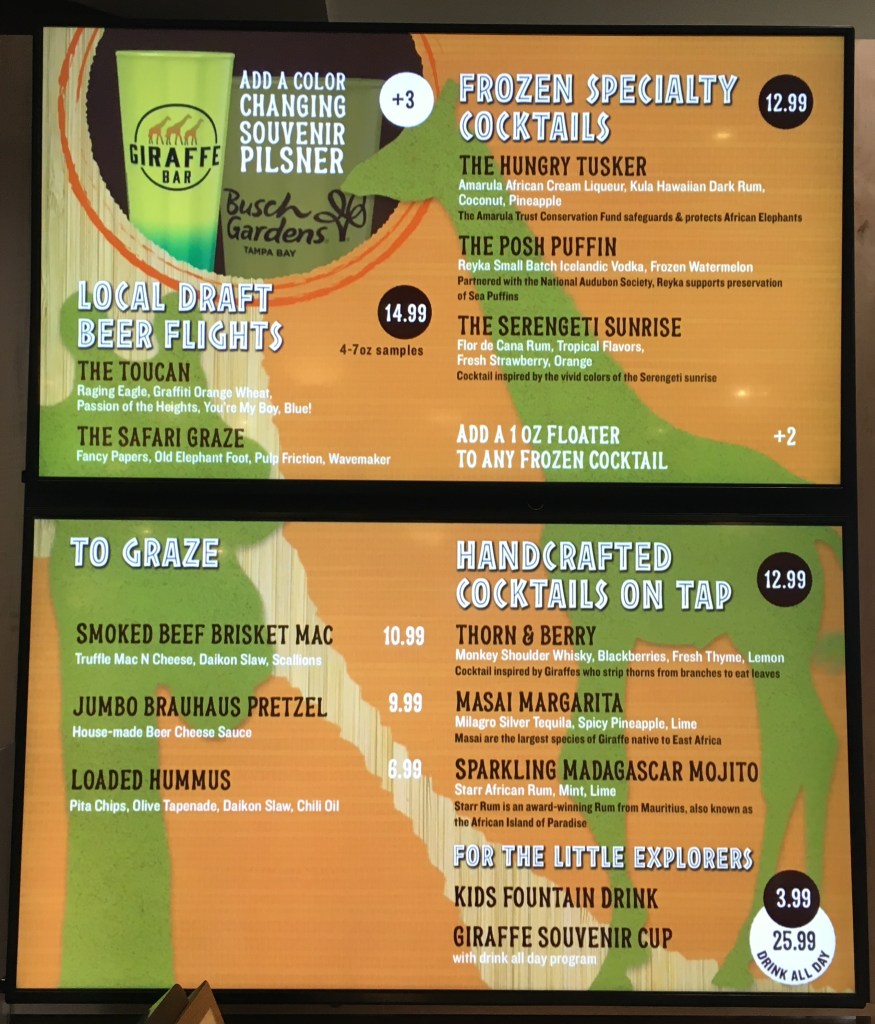 I had a chance to visit the new Giraffe Bar at Busch Gardens in Tampa the week after Easter and it was a great experience. The bar is in the Sarengeti Overlook with great indoor and outdoor spaces all with spectacular views of the animals and rides. The bartenders have cute giraffe headbands and the look is both fun and classy at the same time. Here’s a great promo video from the park to give you a taste of the vibe. I was a little worried being it was brand new and the park was decently busy (food lines were often longer than ride lines), but the line at the Giraffe Bar was surprisingly short and moved quickly.