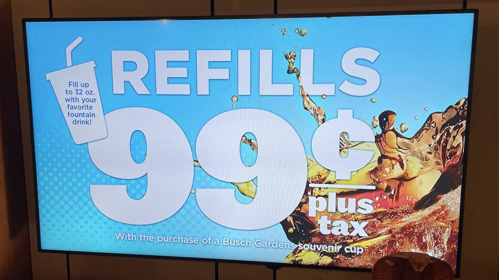 April 2025 Update: As of late 2024 the refill price is now $1.99. Given inflation this is still a great deal. Cups are priced at $19.99 each (with unlimited refills the day you buy it) and get as cheap as $15.99 if you buy multiple cups. You can use the same cup for years across the whole chain of parks. All day unlimited refills on an old cup are $6.99 to $8.99 depending on if you are at at SeaWorld, Aquatica or Busch Gardens. You’ll usually get a sticker showing you have free refills for the day. If you get a meal plan you can upgrade to a souvenir cup with unlimited refills for $5.99. Any of these on a hot summer day or sharing with a significant others can be still be a great deal.