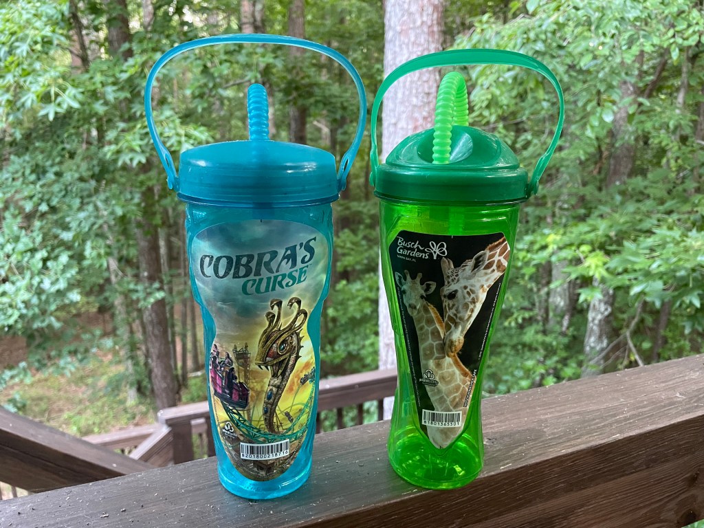 Busch Gardens has one of the best beverage refill programs. Like many parks they have souvenir sports bottles that have unlimited refills the day you buy them. However, my favorite part is that on future days you can get refills for just $0.99! You can use the same bottles year after year and you can use them at different SeaWorld Parks (prices vary a little) and even refill them with slush. Our bottles (see below) are about 5 years old and have been to Busch Gardens Williamsburg and SeaWorld Orlando.