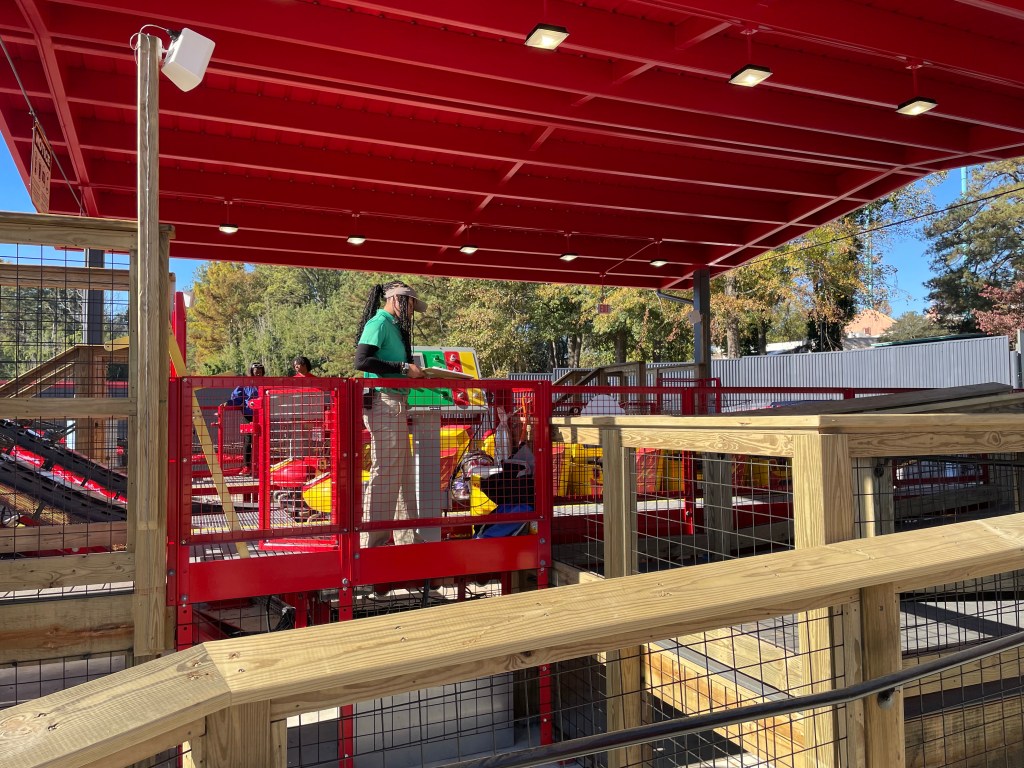 There’s only a couple of minor areas for improvement that I see here that could easily be remedied. The first is the queue line. It’s a really cool circular structure, but it’s essentially 100% in the sun. That was totally fine for a Saturday in November, but come July in Georgia I could easily see some families baking in the sun. However, putting up some sun shades or sails would easily fix this. The other is also queue related in that the attraction has one main line with a team member splitting people up between the two train lines just before the station. The “red” side has to pass under the lift hill and positioning the employee just before the crossover appeared to be to make sure no one was under the tracks during operation (which makes sense). However, because of families wanting to ride together or people wanting front row, back row, etc., this had the effect of the red side often going out with 1-2 rows empty even though the overall line was long. Granted, the ride will probably not be that busy regularly, but on busy days hopefully the operations teams can implement small procedural changes to push the trains out more full. Both these things are easily remedied minor compared to what is an overall EXCELLENT addition to the park.