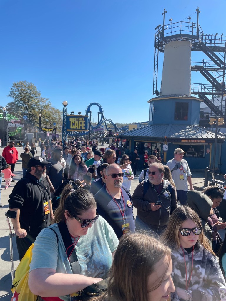 Opening day at Six Flags Over Georgia was glorious. The weather was perfect with blue skies and pleasant fall weather. There was a DJ creating great atmosphere, an opening ceremony, confetti, opening day buttons and bunches of Six Flags staff adding energy. By the start of 12:15 opening ceremony the line stretched all the way back to Batman, probably the longest line this ride will ever see. The park President came out to cut a big red ribbon and the ride was open! We were lucky enough to get out on the 2nd “public” train on the yellow side.