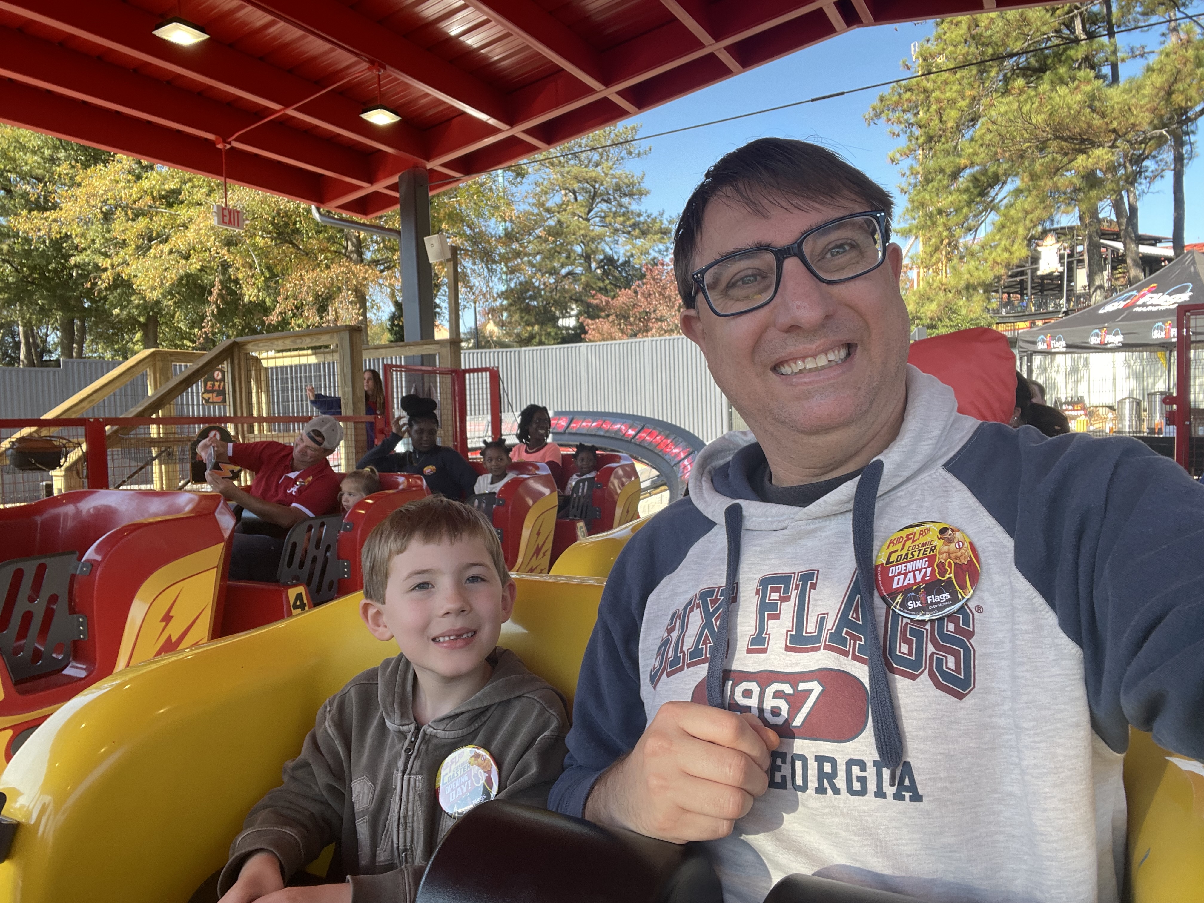 Opening day for a new coaster is a special day you’ll seek out once you’ve done it once. The buzz in the air and the party atmosphere makes for loads of fun. I had a chance to visit Six Flags Over Georgia for the Kid Flash Cosmic Coaster opening ceremony and the technical rehearsal on Saturday, November 4th. I was a “Six Flags” day (as they say at the park) that did not leave me disappointed. This is a great new set of coasters that kids will love and parents will enjoy too.