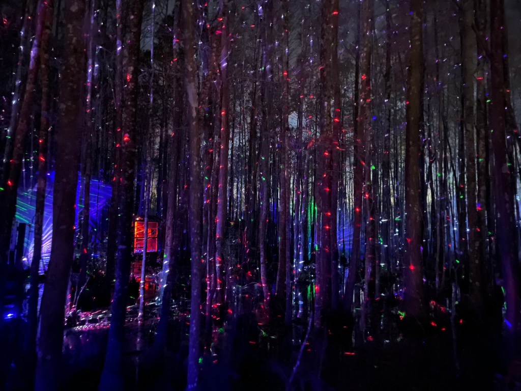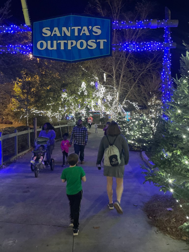 After the sun goes down is when the magic really begins. There are lights everywhere, more the 2 million according to the park. The light displays are almost too numerous to describe from the main tree at the center of the park, light shows on the lake every 30 minutes after dark, a tunnel of lights near Boomerang, lights everywhere at Santa’s Outpost and subtle adorable displays everywhere else. The star of the show that can’t be missed is the “Wonder Walk” wooden walkway through 2.5 acres of woods (what’s normally the Alapaha Trail) as it had one of the most spectacular Christmas light displays I’ve ever seen. It starts off as just some beautifully decorated trees in a forest and them morphs into an awe inspiring display of color using fog machines and laser projection. It just has to be seen and experienced to do it any justice.