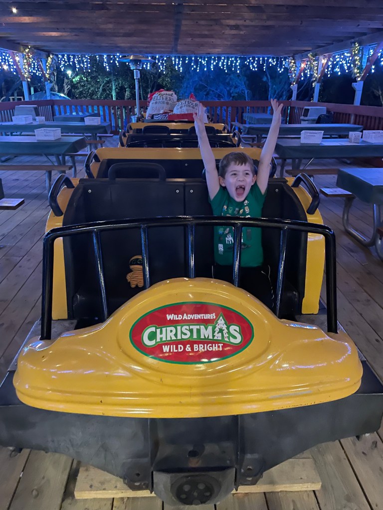 Most theme parks in moderate climates have some sort of holiday event whether that “Smokey Mountain Christmas” at Dollywood or “Holiday in the Park” at Six Flags. New for 2023 at Wild Adventures is their Christmas event “Wild & Bright”. We had a chance to experience Wild & Bright the Saturday after Thanksgiving and absolutely loved the abundant and varied activities throughout the park. This event has so many things happening that it’s ridiculous, much of it geared toward families, kids and the young at heart. We went on a Saturday and there were 45 events (some duplicates) on the schedule! There were literally several Christmas somethings going every hour all day, so much so that we didn’t even come close to seeing everything. Here’s our family’s review and experiences of our spectacular day that really got us into the holiday spirit.