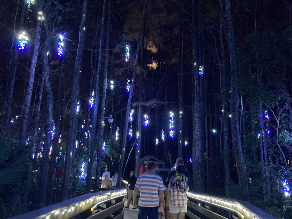 • The Wonder Walk had decorated trees, hanging lights, ground lights and light projection. The fact that it was on a wooden walkway in the woods with animals around made it really neat. The park had a great mix of small displays, a large tree near park center, a light tunnel, a bunch of lights at Santa’s Outpost and beautiful trees synced to music on the lake.