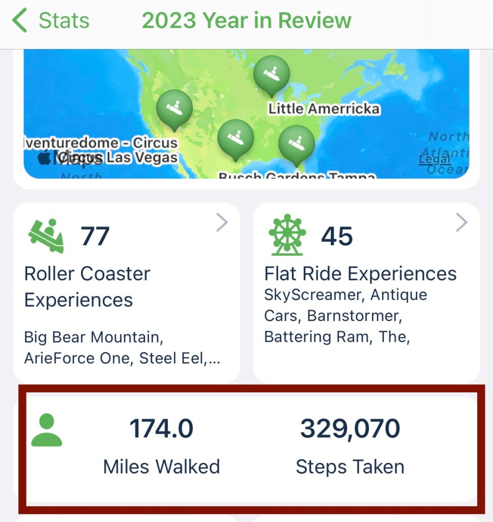 So there’s a cool new “Year in Review” in Log Ride, the app I use to track my credits and visits to parks. In addition to showing roller coasters, locations, tallest, fastest, etc., it also shows steps and miles. I was shocked to see that I had walked 174 miles in theme parks so far this year with over 300,000 steps!