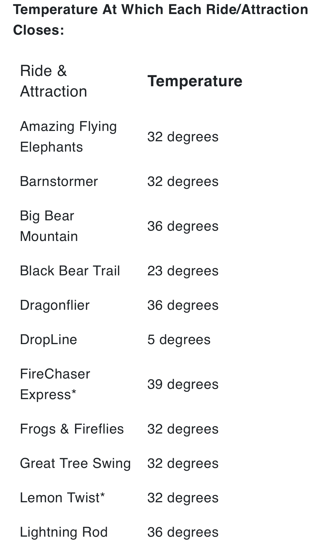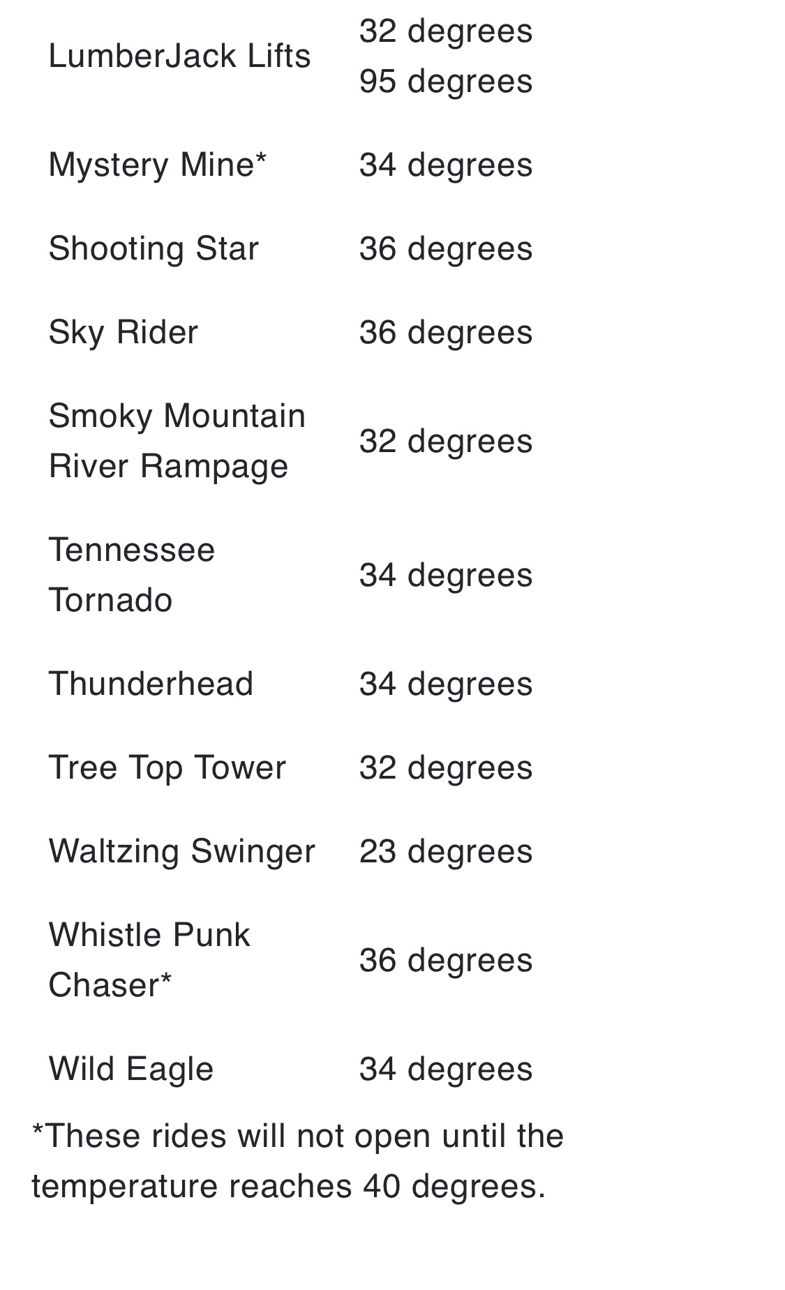 One of the best parks I’ve seen handle cold weather is Dollywood. The park is great that rather than leave people guessing what will be open when, it clearly puts on its website the minimum operating temperatures for each ride. This way you know that if it’s a cool 37 degree morning, there’s no point in heading to the Mystery Mine or FireChaser Express. You can also look at a weather forecast and predict when things will open/close based on temperatures. Let’s hear it for DropLine being good all the way to 5 degrees!