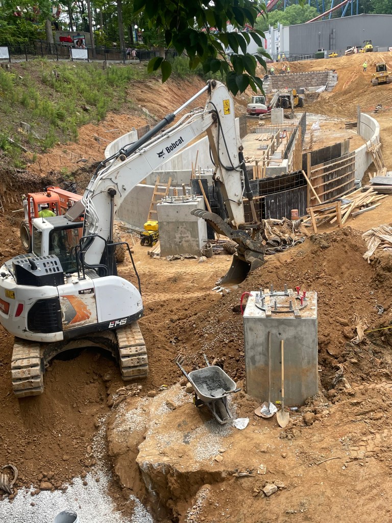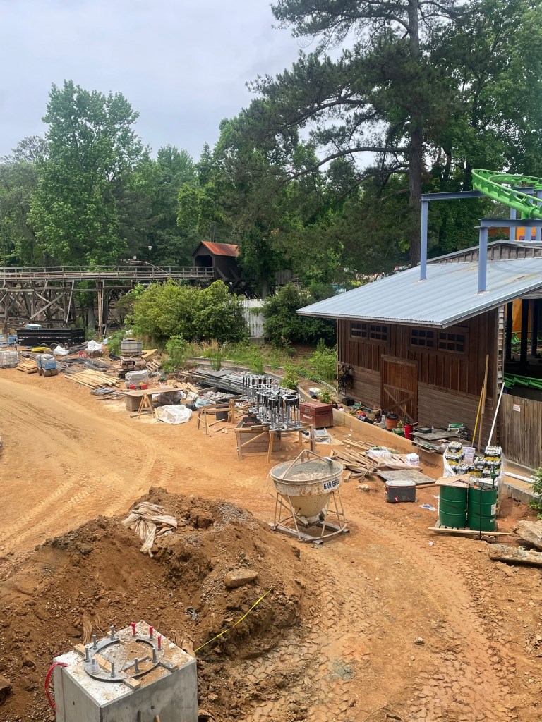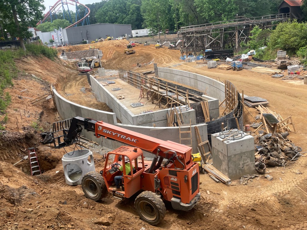 I visited Six Flags Over Georgia on Saturday, May 18, 2024 and was able to check out the construction progress on the new Georgia Surfer coaster by Intamin. It was surprising to see a flurry of activity on a weekend day, so they must be pushing hard to get this done. There were now retaining walls in place, concrete footers poured, the beginning of what appeared to be a water retention area. No track or supports were seen anywhere, but I can’t imagine we’re far away from seeing the installation of the first few pieces.