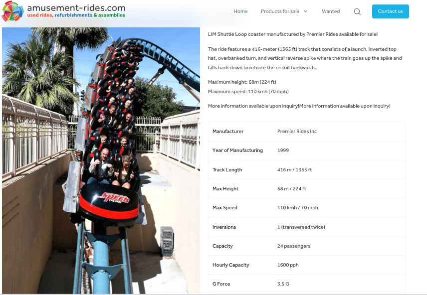 Amusement-Rides.com has some bigger stuff on it. Probably the most recognizable coaster for sale is the Speed the Ride which is a 224 foot LIM shuttle loop coaster by Premier Rides formerly located at the Sahara hotel on the Las Vegas strip! There’s also a Vekoma SLC under reservation, a Schwarzkopf, a Zamperla flying coaster and even an Intamin on there. No prices are mentioned, just “Contact Us”, but you’d imagine these would be more in the hundreds of thousands of dollars or even low millions to purchase.
