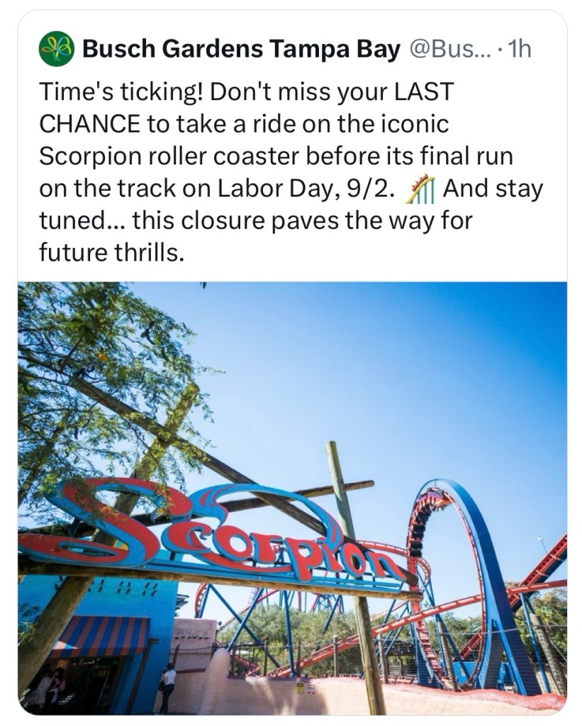 “Time’s ticking! Don’t miss your LAST CHANCE to take a ride on the iconic Scorpion roller coaster before its final run on the track on Labor Day, 9/2. And stay tuned… this closure paves the way for future thrills.”