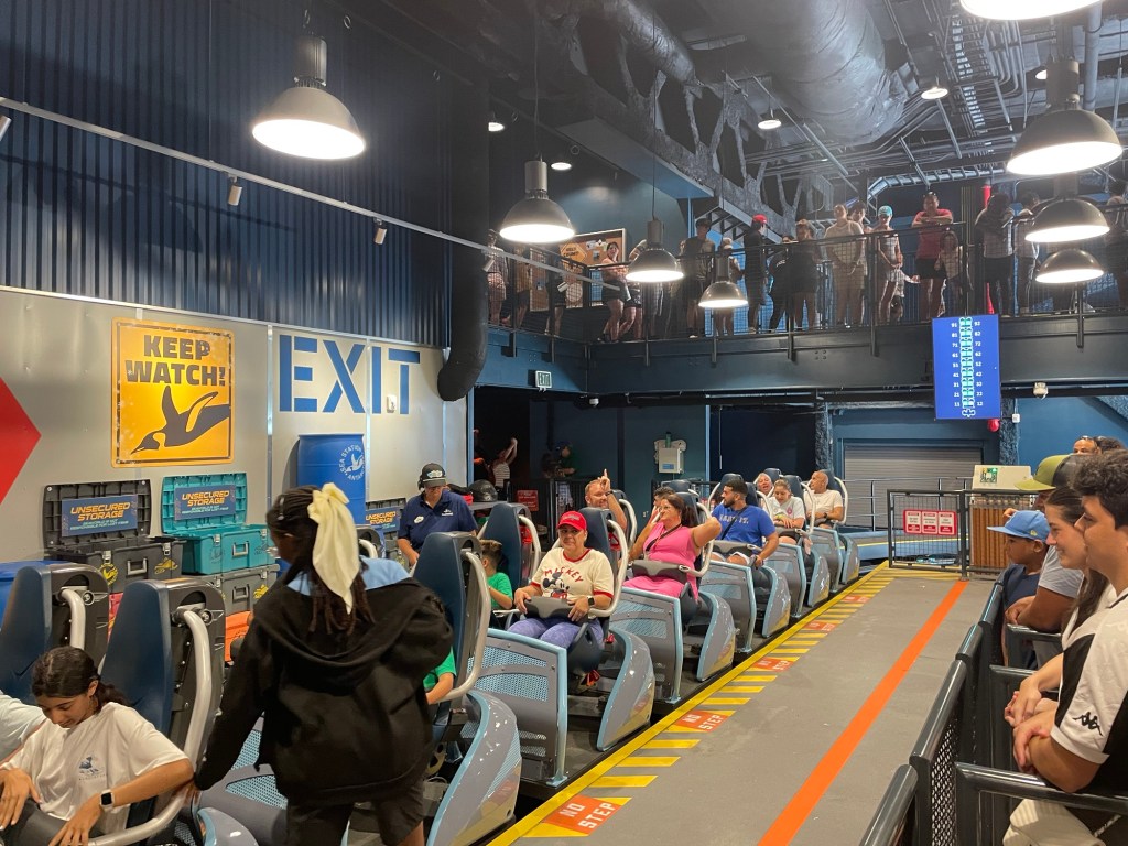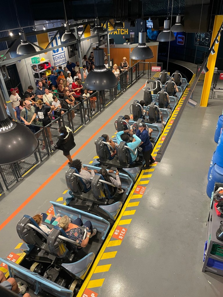 The ride has a very family friendly 42″ height requirement and a maximum height of 78″. This I believe is causing some issues. In the short time I was waiting to board I saw 3 people of moderate to large size have to do the “walk of shame” and leave the train because the restraint could not close adequately enough to have the sensor show on the in station screen that it was locked. Ride operators would push and have people shift in the seat, but usually with no luck. I have a love/hate relationship with those screens in that it makes it easier for the operators for sure, but it also lets everyone in line know exactly where someone who might be delaying dispatch is seated. In SeaWorld’s defense there is a test seat outside the attraction where people can check this before waiting in line, but few people do. In B&M’s defense I also imagine it’s hard to get a seat to fit safely both a 42″ and 50 pound kid as well as a 72″ and 275 pound man. So if you’re on the bigger side, just checkout the test seat before getting in line.
