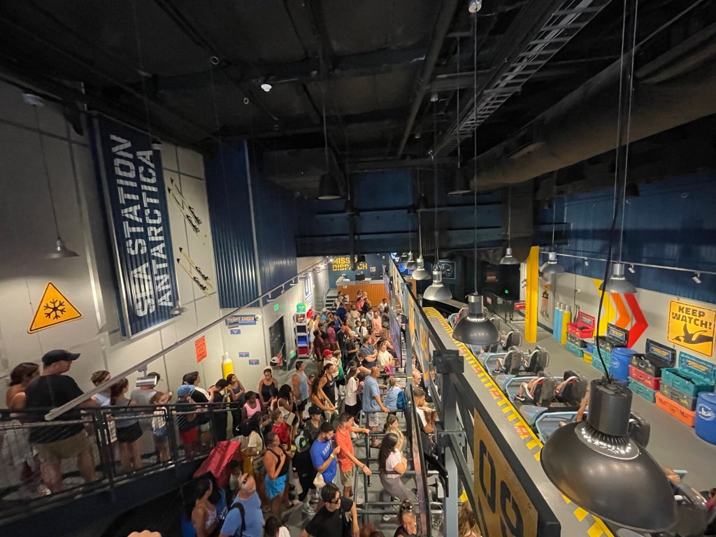 The wait times on Penguin Trek are some of the longest in the park right now as should probably be expected being it’s a new ride. Quick Queue is also given priority here, so even a moderate standby line can move pretty slow. Thankfully much of the queue is indoors and air conditioned with lots of interesting stuff about penguins and Antarctica to read while you wait. After passing through the main queue area you enter the station and there are some great views as you cross over the tracks and see trains enter and exit. I got in right after a rain delay, but on a random Monday evening 75-120 minutes was not an abnormal wait time. Note you load and unload in the same place, so no real need for a locker as there is a place for drink bottles and loose articles.