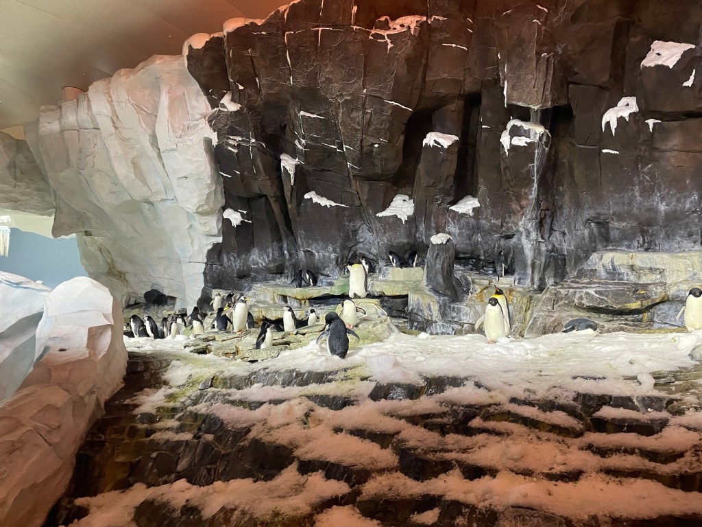The exit for the ride is quite unique and interesting. You exit by a small glassed area of penguins, but this is only the beginning. After going down a ramp you actually enter into the queue line for the old penguin dark ride and walk it in reverse until you reach some doors for the penguin habitat. You may have to wait here a minute or two in a holding area that’s meant as a buffer between the warm ride area and the cold of penguin exhibit. After everyone has been grouped up they’ll let you into the habitat where in open air (no glass) you get to see the penguins playing and frolicking on the ground and in the water. It is quite cold, so if it’s summer and you’re in shorts and t-shirts you may only be able to take it for so long. It’s really a great area with lots of staff to answer questions. You can then exit where of course a gift shop can be found and be on your way. There’s no quick bypass to this that I saw along the way other than emergency exits, so expect a little time between when your ride is done and when you’ll reach outside again.
