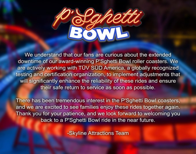 “We understand that our fans are curious about the extended downtime of our award-winning P’Sghetti Bowl roller coasters. We are actively working with TUV SUD America, a globally recognized testing and certification organization, to implement adjustments that will significantly enhance the reliability of these rides and ensure their safe return to service as soon as possible.