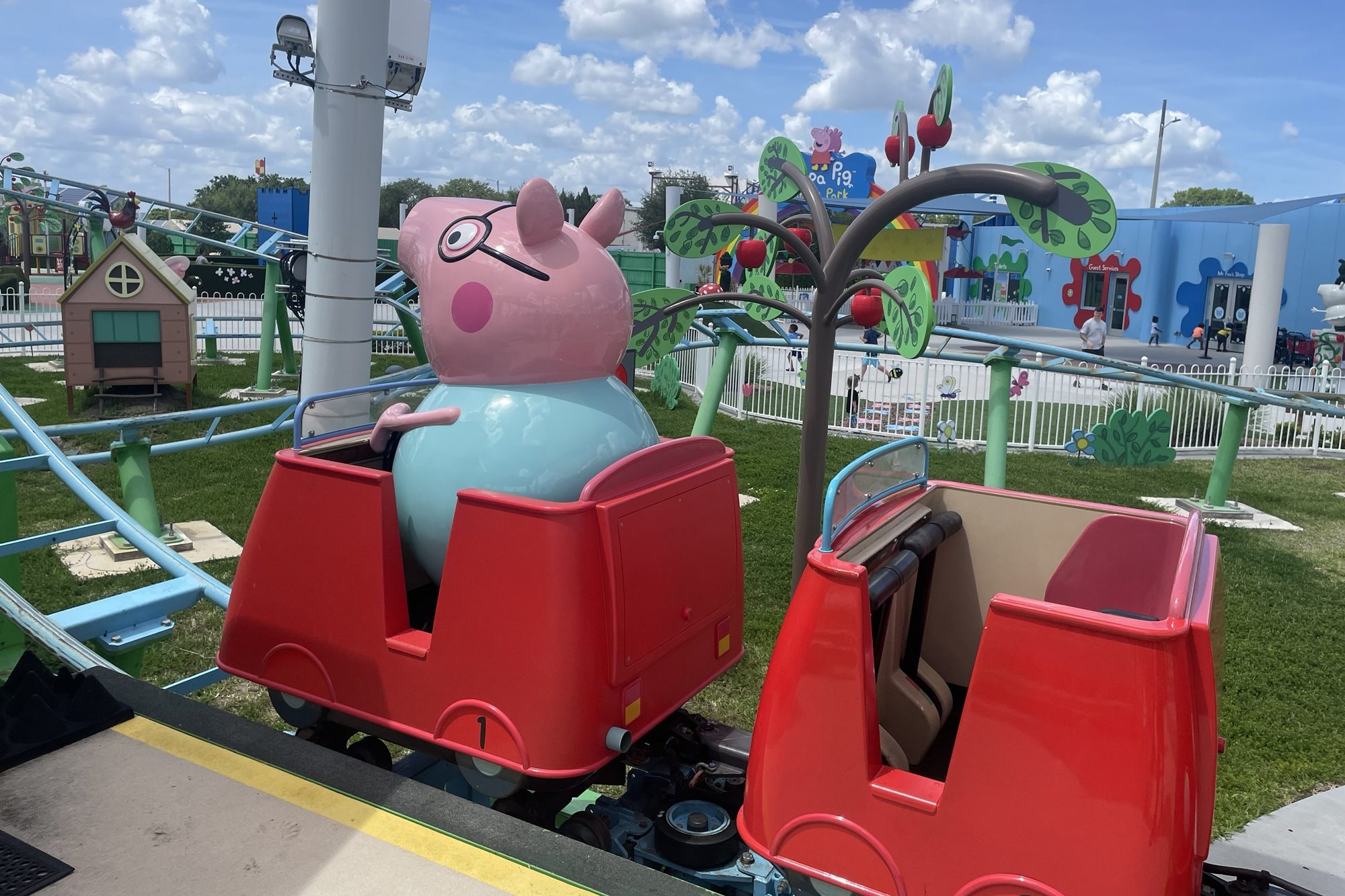 The course itself is pretty well themed. It is a grass field filled with artificial cartoon-like trees. There are stop lights, little structures and a construction crew working the area. This is where my lack of knowledge of Peppa Pig comes in, but it appears to be Mr. Bull and friends. Nothing here is moving or animatronic, but there is some music and sound effects like the sounds of construction as you pass that area and a voice that says. “Daddy’s home” when you pull into the station the first time. The traffic light also turns from red to green as you begin your second lap, so little control touches and synchronization are nice. The whole grassy ride area is surrounded by a white fence that gives it the feeling of a backyard coaster.