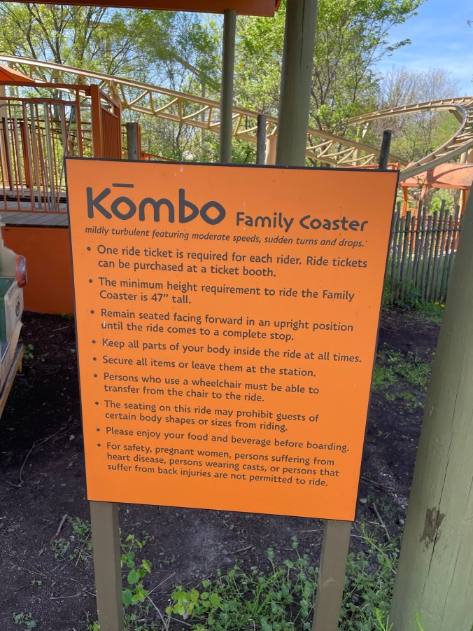 With regard to quirks there are several. First this ride was donated to the Indianapolis Zoo by the Jones Family. That’s such a cool gift to the community, I wish more people donated roller coasters to their favorite locations. It is also odd numerically in that it has a 47″ height requirement. I’m used to 36″ or 48″, but 47″ is an uncommon one for me. It also has an “odd” train literally in that there are 13 rows for 26 riders total. This train is long and massive with a reported hourly capacity of 1400 riders/hour which is crazy for a kiddie coaster. It’s name is also unique with the “ō” giving “Kōmbo” instead of “Kombo” called a “macron” giving it a long sound. I’ll refer to it both ways here as people searching for info will probably use more of the English spelling. The term “kōmbo” is most often correlated to the historical Kōmbo Kingdom in Gambia, but can also mean a water well or be an African greeting.