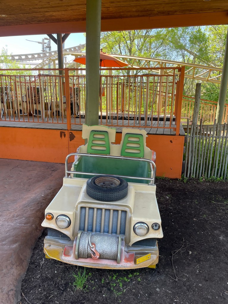 The ride itself is a pretty basic kiddie coaster. It has a wheel drive lift and goes through some twists and turns. No crazy forces here, just fun. You also get to run the course twice which is great. The course itself is great with trees, grasses and small hills helping camouflage some of the track. For $4 it’s not a bad deal at all for a ride. The precautions sign in front of the ride calls it “mildly turbulent featuring moderate speeds, sudden turns and drops.” and mildly turbulent featuring moderate speeds seems like an accurate description. The trains themselves are setup like jeeps and are very comfortable. They look great too and I love how the back of the seats look like gas cans. If you want to check out an old POV of the ride, the one from Theme Park Review is great.