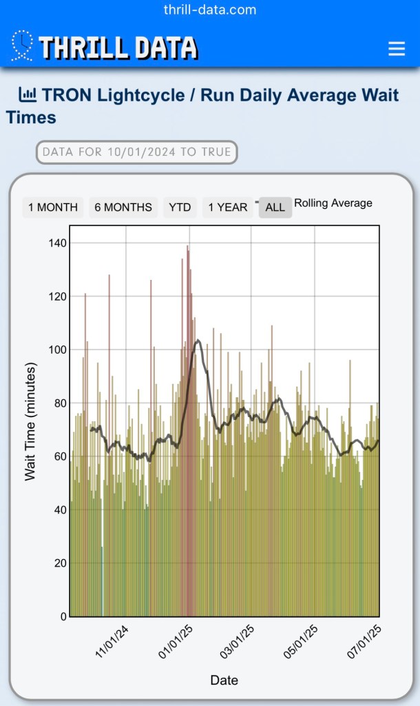 After the removal of Virtual Queue the wait times for these attractions seem quite reasonable. The graphs below are from great data site Thrill-Data.com and shows each of the 3 rides have hovered around 70-80 minutes since its removal from Virtual Queue. There are expected spikes for holidays, but for the most part things have been stable. This is probably helped by the fact that all 3 rides have relatively large hourly capacity. Cosmic Rewind can handle around 2,000 riders/hour while Tron approaches 1,700 riders/hour and Tiana’s is about 1,200 riders/hour.
