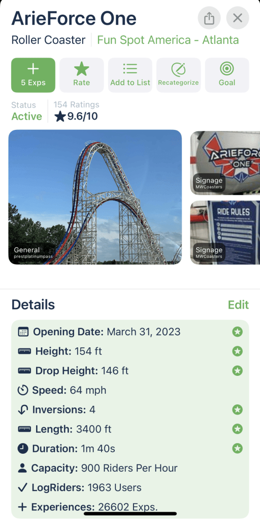 If you’re a stats person you’ll love all the ways you can slice your data. Stuff like coaster count only begins to scratch the surface as you look at rides by manufacturer, active/defunct rides, parks visited, dark rides, water rides, ACE Landmarks ridden and many more. You can also track metrics like inversions experienced in a year, fastest speed, tallest height and many more. LogRide will also create trip reports and using its calendar you can see what you did on any given day. The app is frequently updated with the latest new attractions and closures while also giving the users the chance to submit updates to the developers themselves.