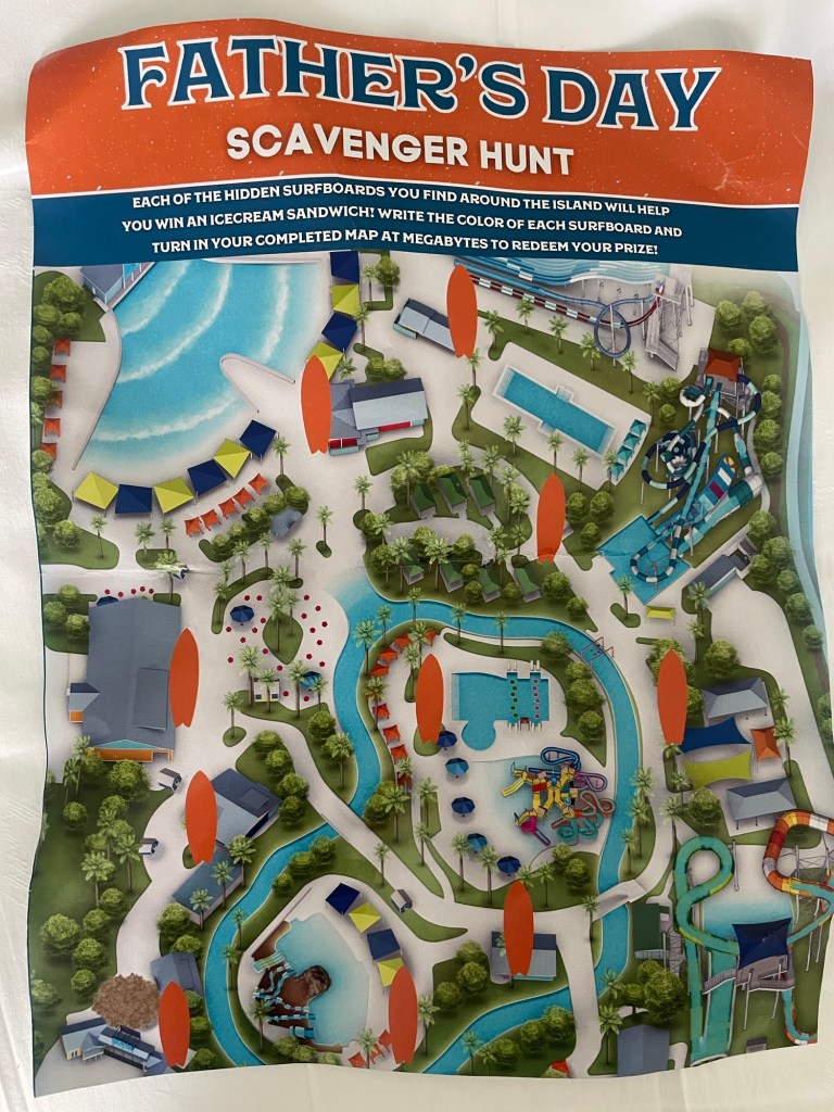 Island H20 recently had a scavenger hunt centered around Father’s Day. It was a relatively simple printed sheet of paper that was handed to guests on entry to the park on Father’s Day weekend where Fathers looked for surfboards throughout the park. If you accomplished this you got the sweet reward of some free ice cream!