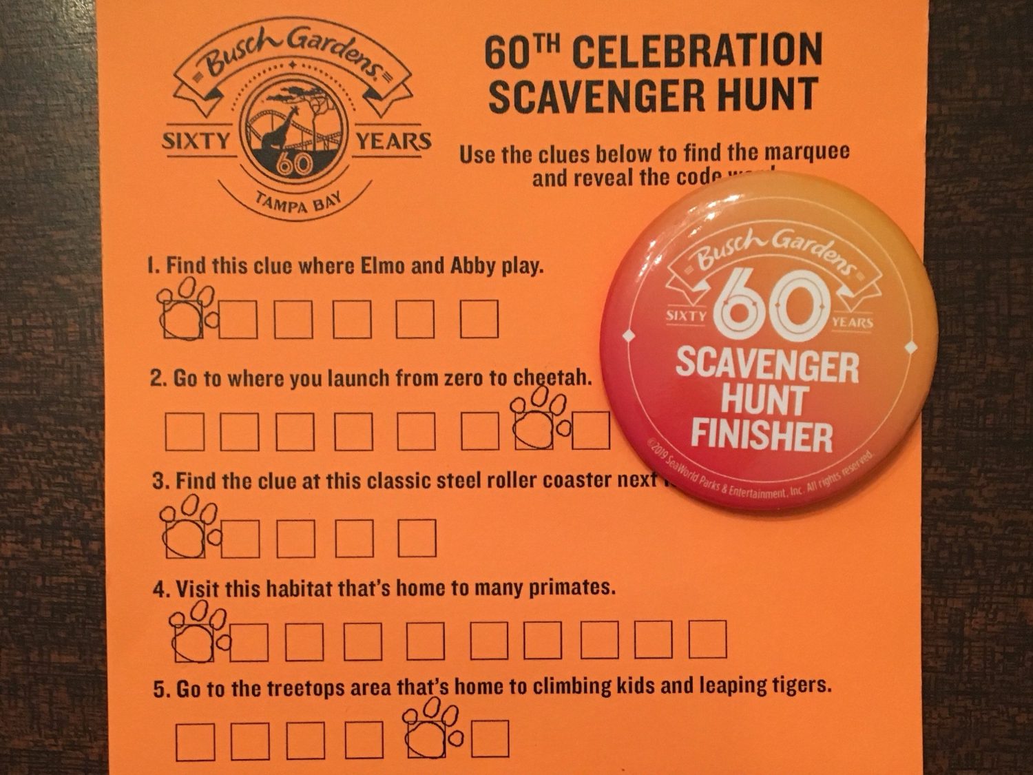 Busch Gardens Tampa had a great scavenger hunt in honor of their 60th anniversary. Busch Gardens used it to tell about their history with information boards throughout the park that provided great history about past attractions and the park in general. These board would provide the answers to trivia questions on a provided sheet which you could then return for a prize.