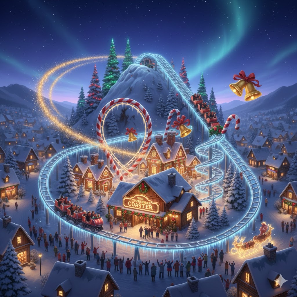 Then whoosh! We fly on reindeer wings, While every rail and girder sings. Through loops that look like candy canes, We’re shaking off the winter reins. A blur of tinsel, gold and bright, A comet streaking through the night!