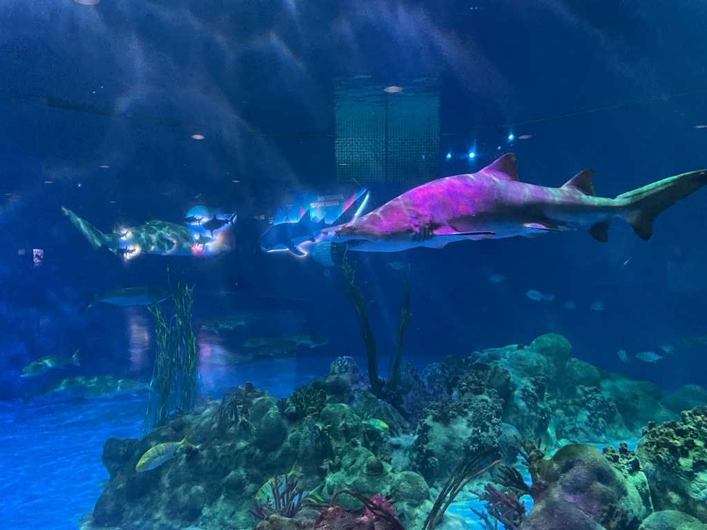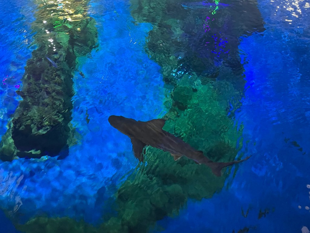 From there you’ll ascend some stairs and you’ll be at the top of the very large shark tank! The area is somewhat “industrial” feeling with lighting, railings, pumps and other equipment nearby. As you look over to the water surface from up against the railings you’ll also see what first appear to be shadows that you eventually realize are the tank’s largest residents, the sharks! The guides provide a fair amount of time for you to just look around and take it all while asking questions.