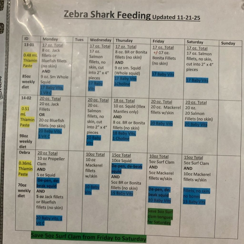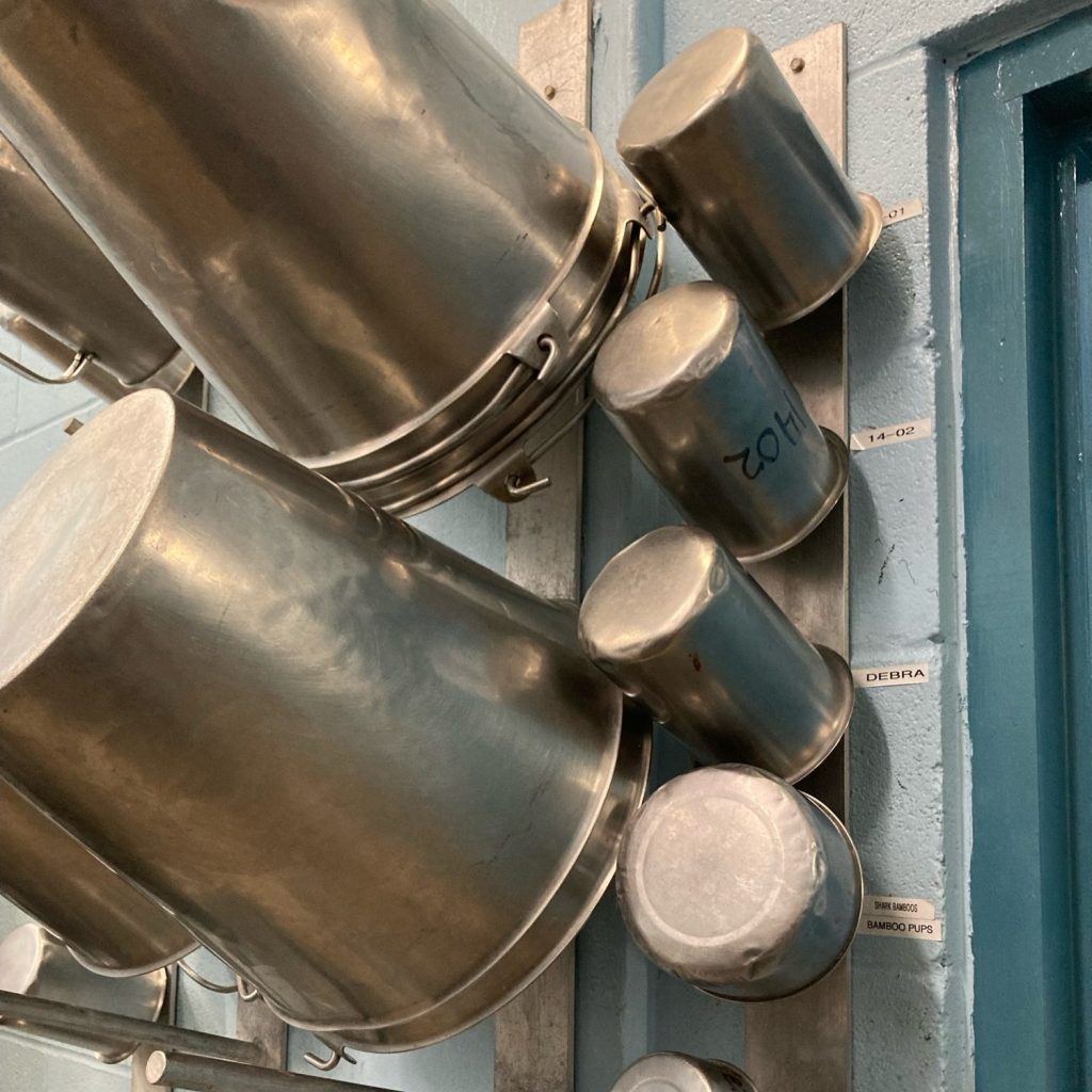The Shark Encounter takes place inside the Explorer’s Reef Aquarium, a 450,000 gallon cylindrical salt water aquarium with living coral containing sharks and other species. You start by walking behind the building and going into an employee entrance. Upon entering you will immediately notice the relative cool and an “ocean” smell. The first place you’ll stop is a kitchen area where you’ll see where the food for the different animals is prepared. The guides will describe in good detail how they manage the diets of all of the tank’s different residents.