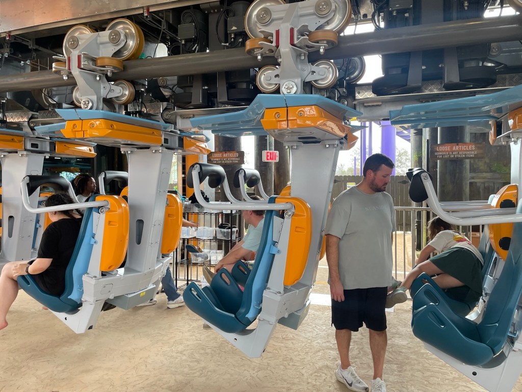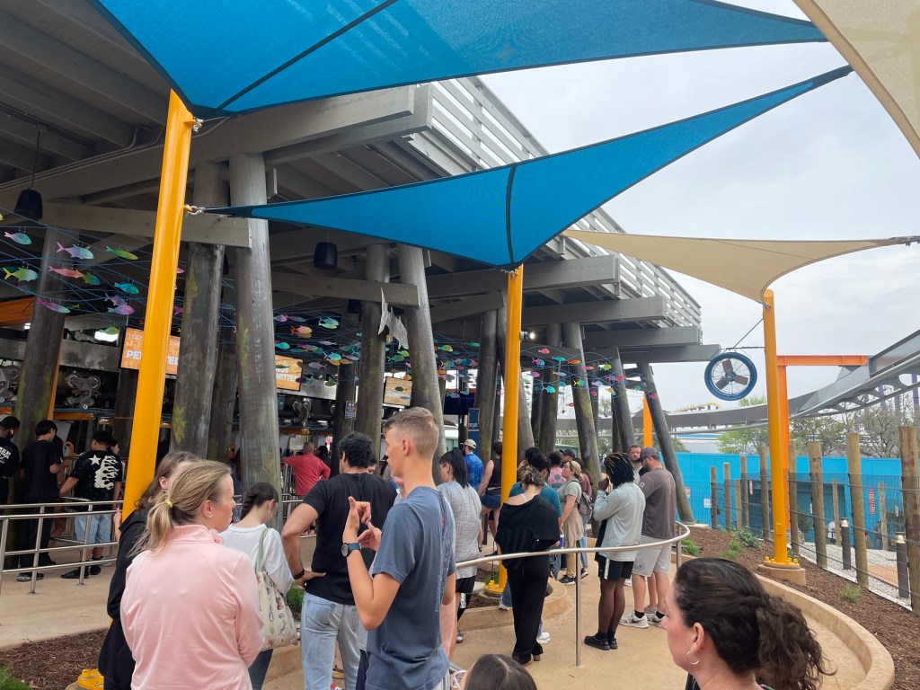 The station looked great, nothing over the top, but some nice screens and metal fish hanging above that have a wind chime effect. The restraints are comfortable and they do have bins for loose articles which they heavily enforce with all glasses needing a strap or they must be removed. The capacity here is a bit concerning as they have a screen showing dispatches the last hour and current hour. They appeared to be averaging 12-14 dispatches/hour (probably because of patrolling loose articles) and thus a MAX of 240-280 riders/hour. For some perspective, Great White, its bigger B&M cousin just across the park handles up to 1,400 riders/hour. On a Monday night at 6pm we waited about 15-20 minutes, but on a busy day with heavy Quick Queue use I’d expect this to have the longest standby time in the park. Also be aware this ride has a maximum 77” height if you’re on the taller side.